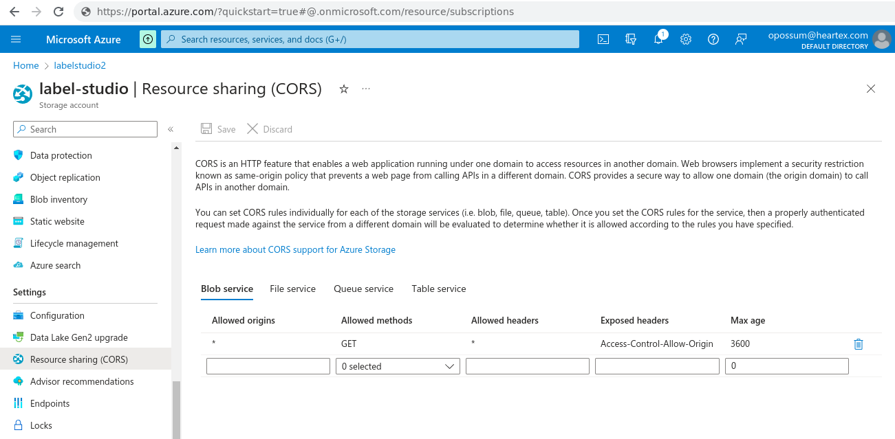 Configure the specific Azure Blob container that you want Label Studio to use in the UI. In most cases involving CORS issues, the GET permission (/GET//Access-Control-Allow-Origin/3600) is necessary within the Resource Sharing tab: