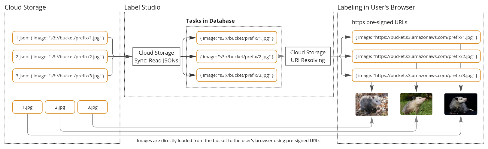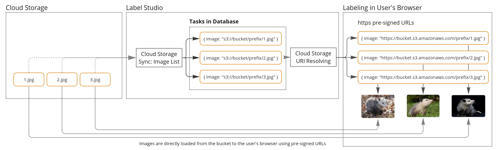 Task data synced from cloud storage is not stored in Label Studio. Instead, the data is accessed using a URL. You can also secure access to cloud storage using cloud storage credentials. For details, see Secure access to cloud storage.